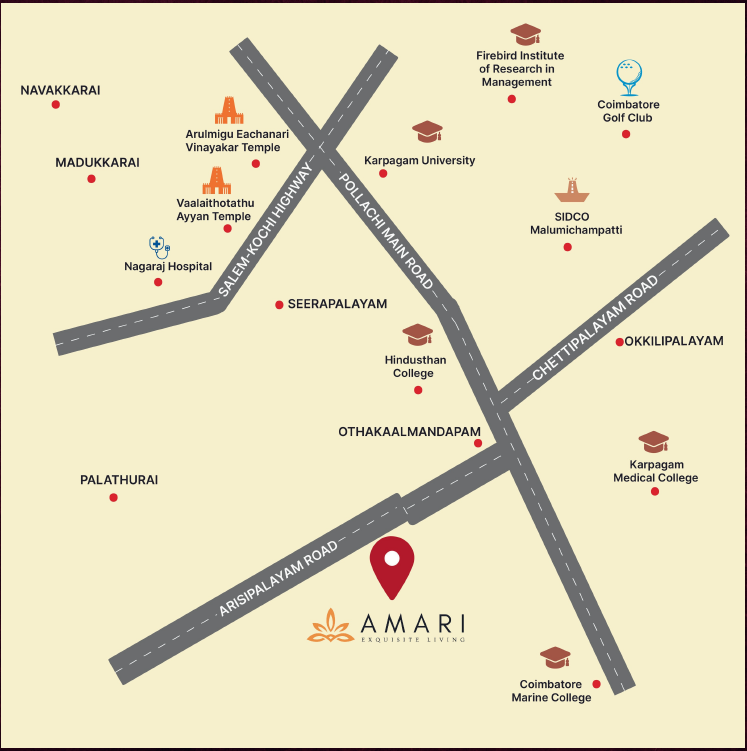 Amari Avenue offers peaceful suburban living with easy access to Coimbatore’s southern regions. It is perfect for families looking for a home in a quiet neighborhood with ample green spaces, schools, and everyday conveniences nearby.
